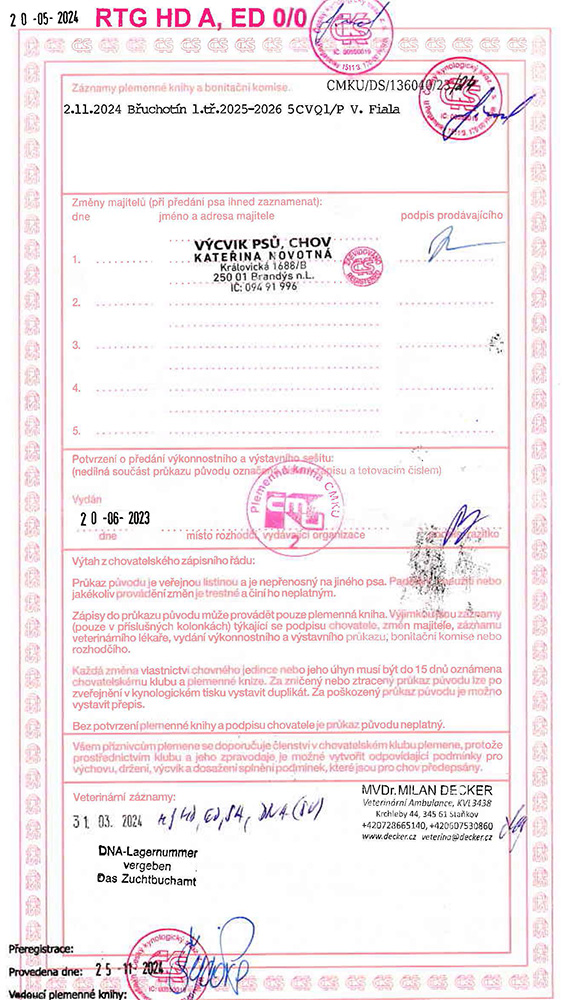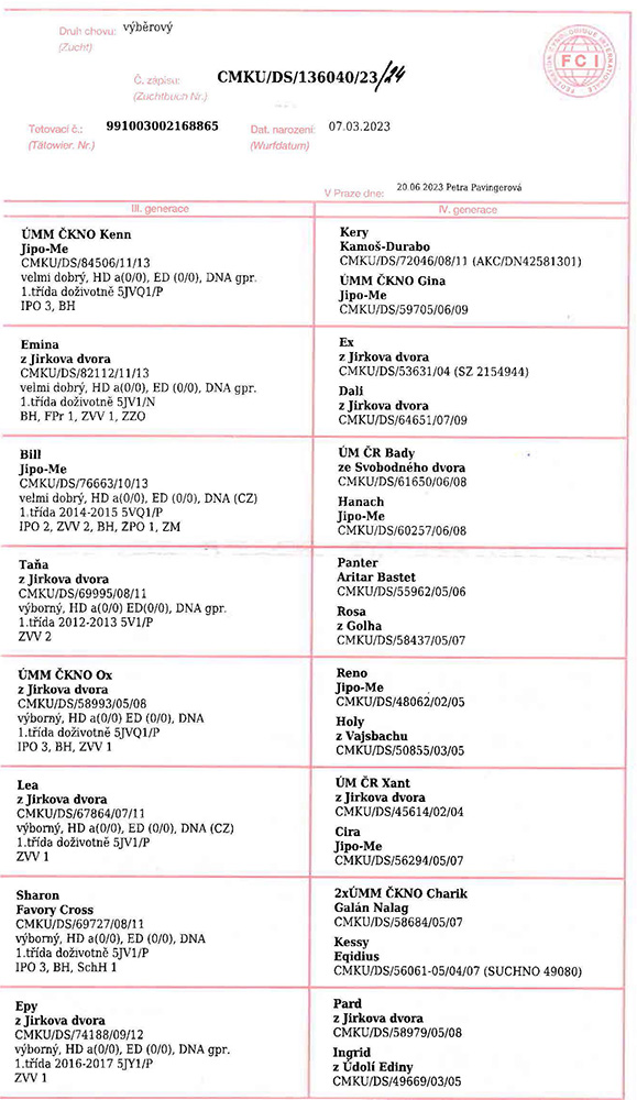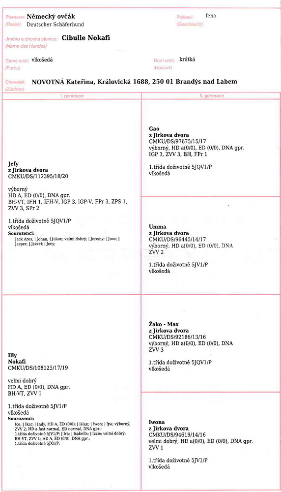 From her dam's (ILLY Nokafi) side she belongs to the 4th bloodline namely to branch founded by world renowned GERO z Blatenskeho zamku, followed by XAC z Pohranicni straze, RENO Jipo Me, OX z Jirkova dvora