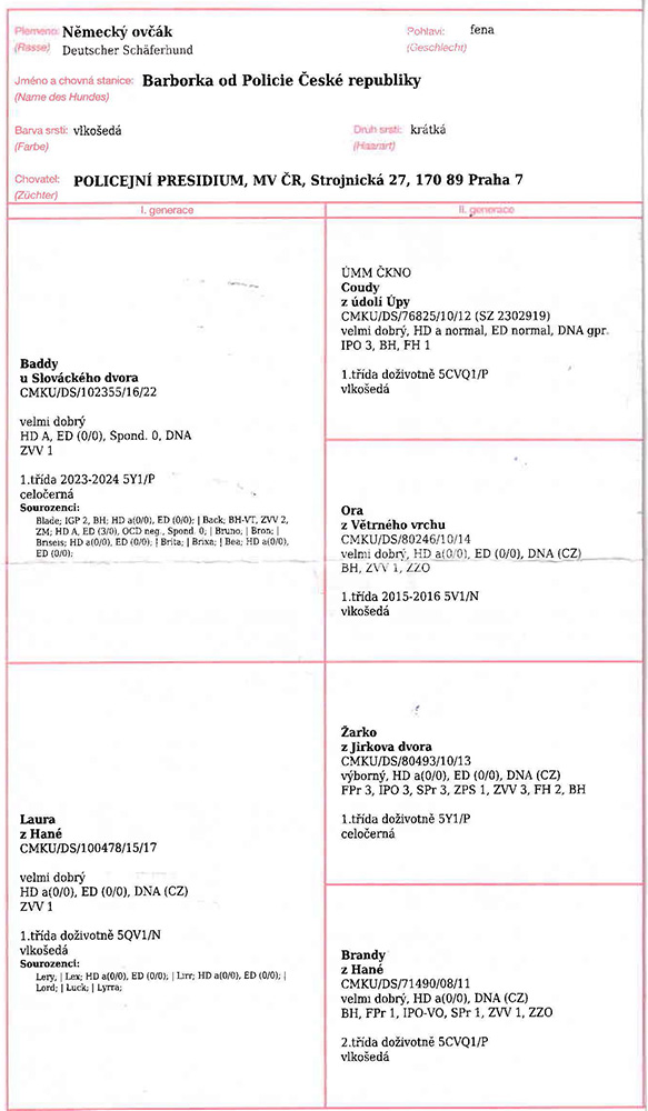 BARBORKA belonds from her sire's side (BADDY u Slovackeho dvora) to the 5th bloodline namely to the branch founded by famous DDR dog INGO v. Rudingen followed by TOM, ELLUTE, ZAR v.d. Schiffslache.