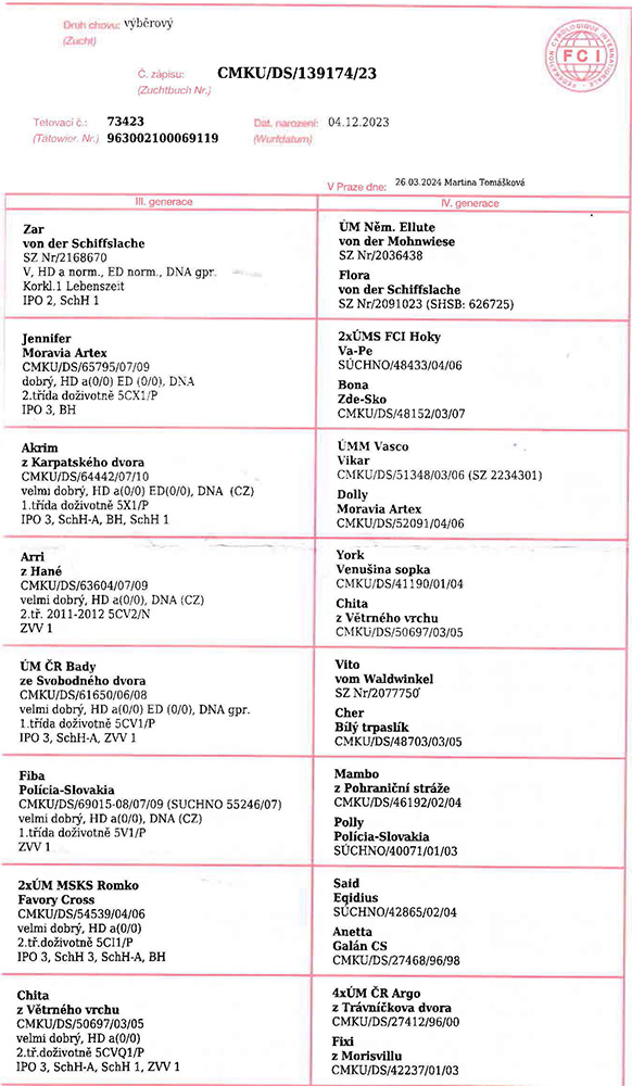 From her dam's (ILLY Nokafi) side she belongs to the 4th bloodline namely to branch founded by world renowned GERO z Blatenskeho zamku, followed by XAC z Pohranicni straze, RENO Jipo Me, OX z Jirkova dvora